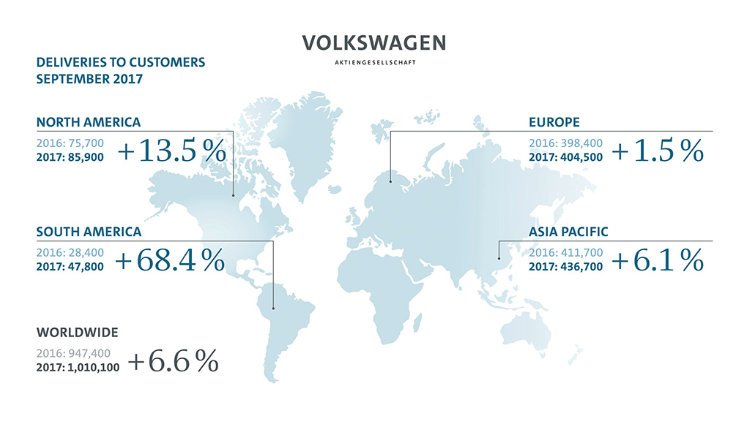 The Volkswagen Group (including VW, Audi, Skoda, Seat, Porsche, MAN and Scania) had its best month ever in September 2017 when worldwide deliveries exceeded a million cars in a single calendar month for the first time ever with 1,010,100 cars delivered. During the first three quarters of 2017, VW Group deliveries worldwide increased by 2.6% to 7,806,700 cars.