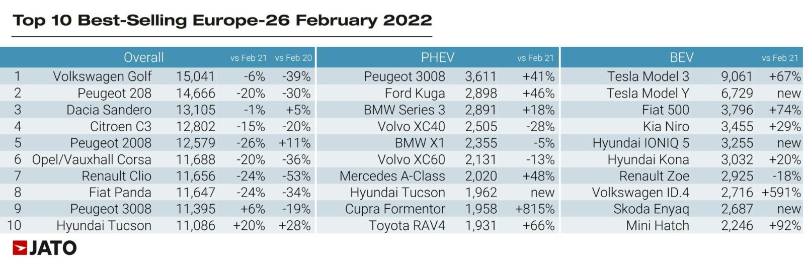 The Volkswagen Golf was again the most popular car in Europe in February 2022. However, year to date 2022, the VW Golf was narrowly outsold by both the Peugeot 208 and the Dacia Sandero. Within the top 10, only the Peugeot 3008 and Hyundai Tucson registered growth in February.
