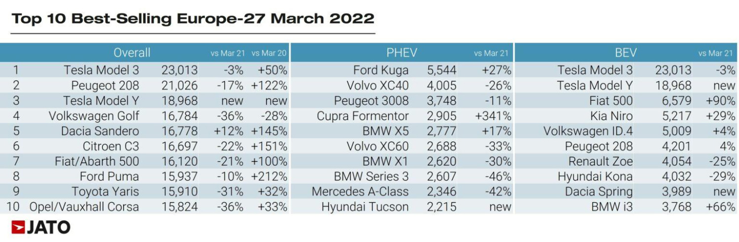 In March 2022, the European new car market was 20% weaker with electric vehicles gaining market share and the Tesla Model 3 the top-selling car in Europe.